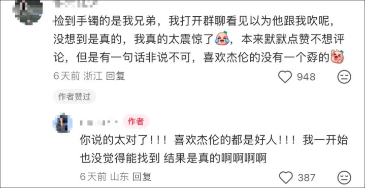 有网友在评论区说:“捡到手镯的是我兄弟,我打开群聊看见以为他跟我吹呢,没想到是真的,我真的太震惊了,本来默默点赞不想评论,但是有一句话非说不可,喜欢杰伦的没有一个孬的。”