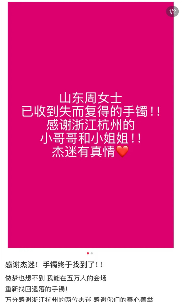 4天前,周女士再次发文,已拿到手镯并表示感谢:“做梦也想不到,我能在五万人的会场重新找回遗落的手镯!万分感谢浙江杭州的两位杰迷,感谢你们的善心善举。感谢所有评论区网友帮我助力,感谢杰迷,感谢周杰伦,感谢自带拾金不昧buff的杰伦演唱会!”